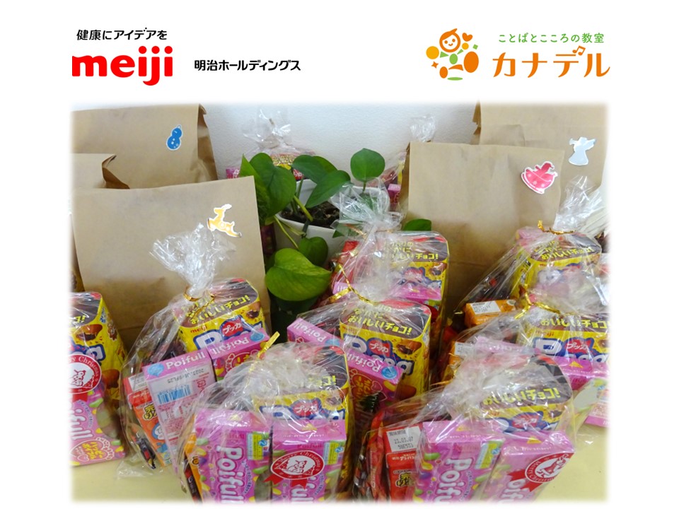 「ことばとこころの教室 カナデル」の染川です。昨年12月に明治ホールディングス株式会社 株主様より、お菓子のご寄贈を頂きました。 教室に届いた大きな段ボール4箱には、子どもたちの大好きな明治製菓のお菓子がたくさん♪スタッフが包装して、一人ひとり... -